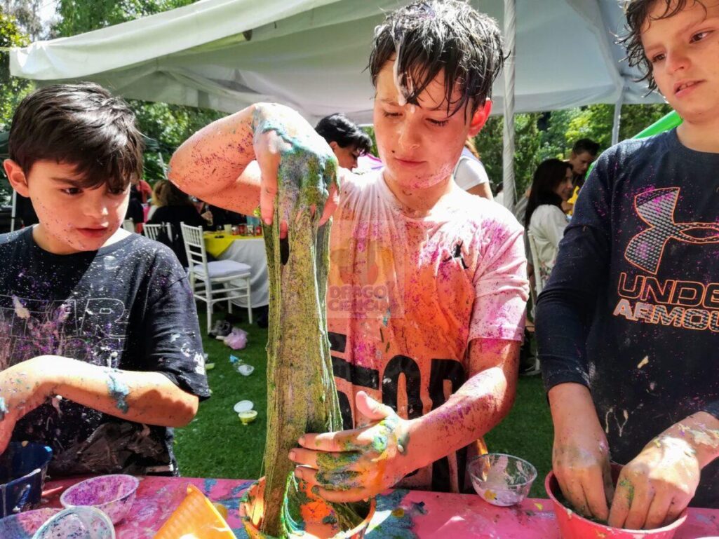 Niños haciendo slimes multicolor en fiesta de experimentos Dragociencia